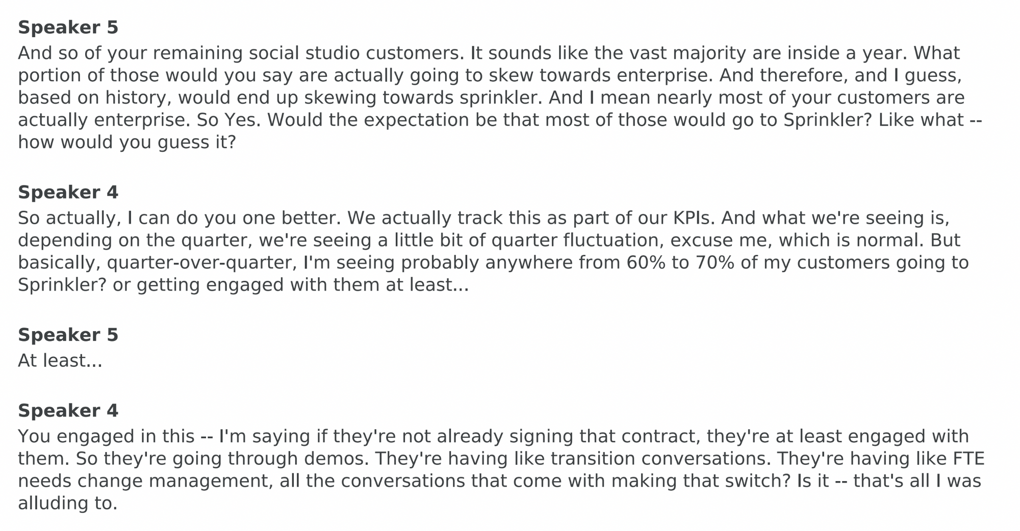 "I think current customer expansions were a challenge because a lot of the companies that we've traditionally done business with, like retailers had done a lot of layoffs. So I came into a lot of accounts that had shelfware because they bought 50 seats of Sprout and then they laid off half their marketing team. So they're like, well we, you know, we're very happy with Sprout, it's a great platform, but we have 20 extra seats here so there's no reason for us to spend additional money on the platform. And sprout doesn't have a lot of like premium add-on offerings. So if if you're not adding seats and they've kind of already got listening or advanced analytics, you don't really have much more in your bag that you can sell a current customer."