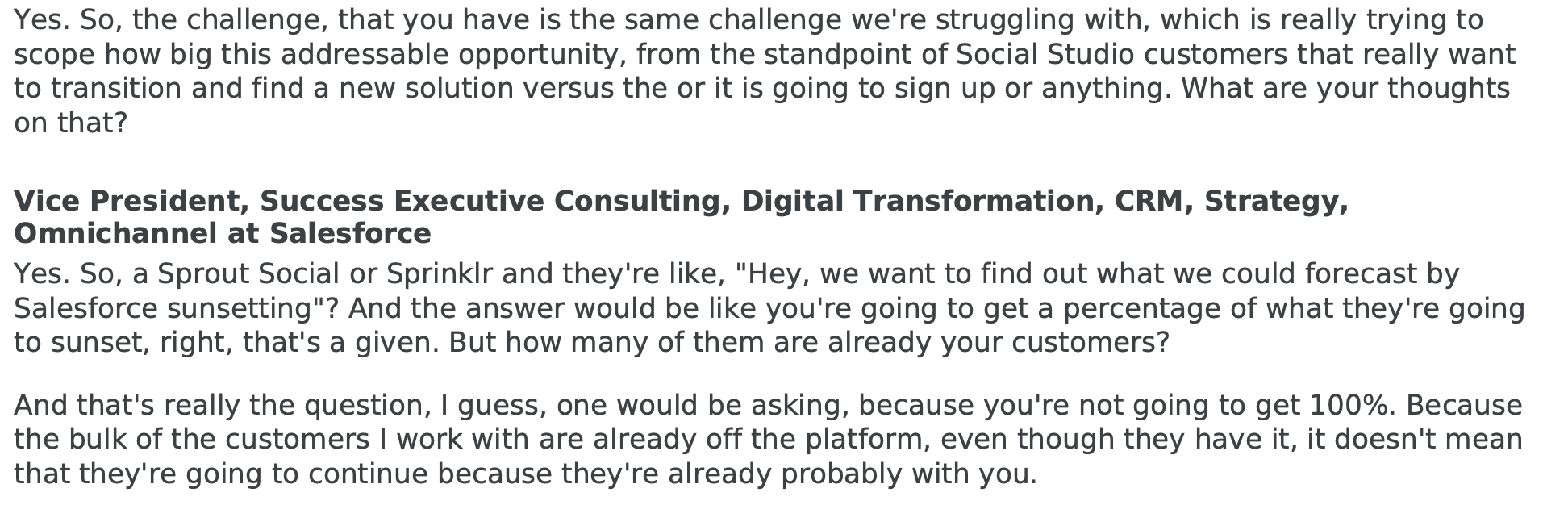 Now, here is an excerpt from a recent expert call with a $10bl EV SaaS company that migrated from Sprout to Sprinklr over the past month.