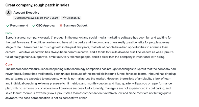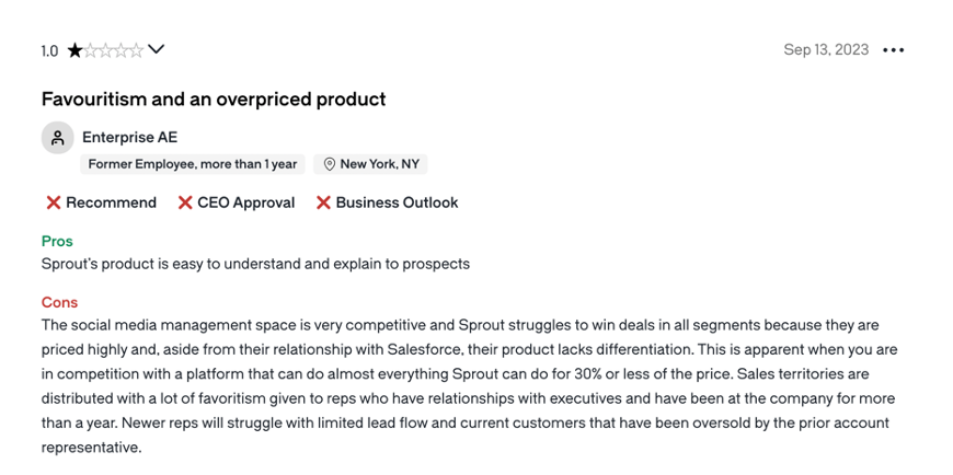 "The product itself is the top three solution. The training is, is great. The onboarding, like generally the culture is pretty solid. So de it, yeah, depending on at what point you are in your sales career, it could be a, a good environment to sell in if you're like a maybe an Smb seller reasons against, I think they've, there's just too much competition in social media management. It's a, it's a very premium priced solution. So you have an uphill battle when you're trying to sell the solution because oftentimes it, you might think it's a, it might be better and the customer right, right. Might even agree with you that yes, it is a better solution, but the cost is just so much greater that you can't get them to pull the trigger. So I would just say it's a very difficult selling environment and because upper management has these incredibly aggressive growth goals that has filtered down to the sales team and it's started to have a, a significantly negative effect on the, the culture there across the sales team. Somebody puts a number in front of you and it's completely unreasonable. You just go like, Hey look, I, there's no way this isn't gonna happen. So you, you, I know this is getting pushed down from upper management, but you can't put a number in front of this, in front of a sales rep like this and expect them to hit it when there's no inbound business."