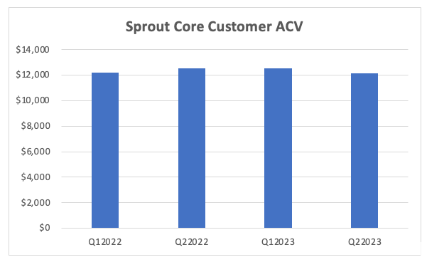 These selective disclosures really make your head spin because simply put roughly 80% of Sprout’s ARR over the past two years has come from $10k+ customers. They did get a notable uplift in the sub $10k ACV due to pricing changes, but it’s not exactly a needle mover as that customer base is more like a sub $4k cohort. So, growth really was coming from ~ $35k ACV customers in aggregate and landing roughly 2k of those a year during the Covid boom times. This part of the business is trending around 20% slower now and would be more than 50-60% slower if it was not for the timing of the Social Studio sunset. It’s really that simple if management wanted to communicate clearly and honestly with their investors.